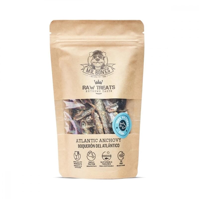 Mr.BonesRaw Treats Atlantisk Ansjos er naturlige, funksjonelle og svært smakfuller godbiter, ideellle for å stelle og skjemme bort kjøledyret ditt.